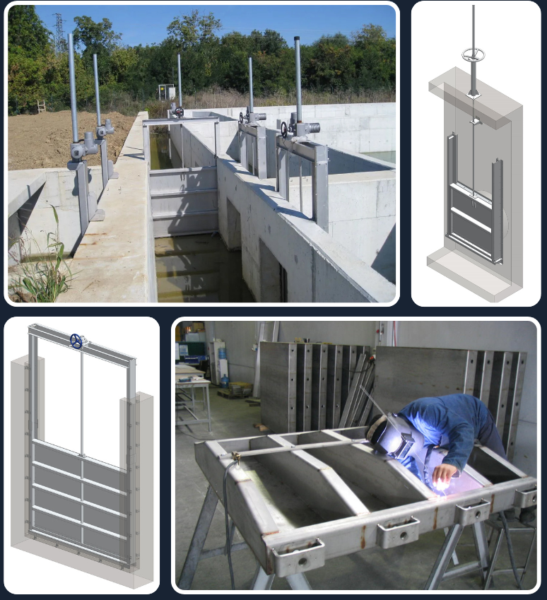 Treatment Plant Gates (penstocks): These are water retention gates made of stainless steel with all grids. They retain water and are used in maintenance work on canals, tanks, channels and sump tanks and the operation is manual, electrical and pneumatic.