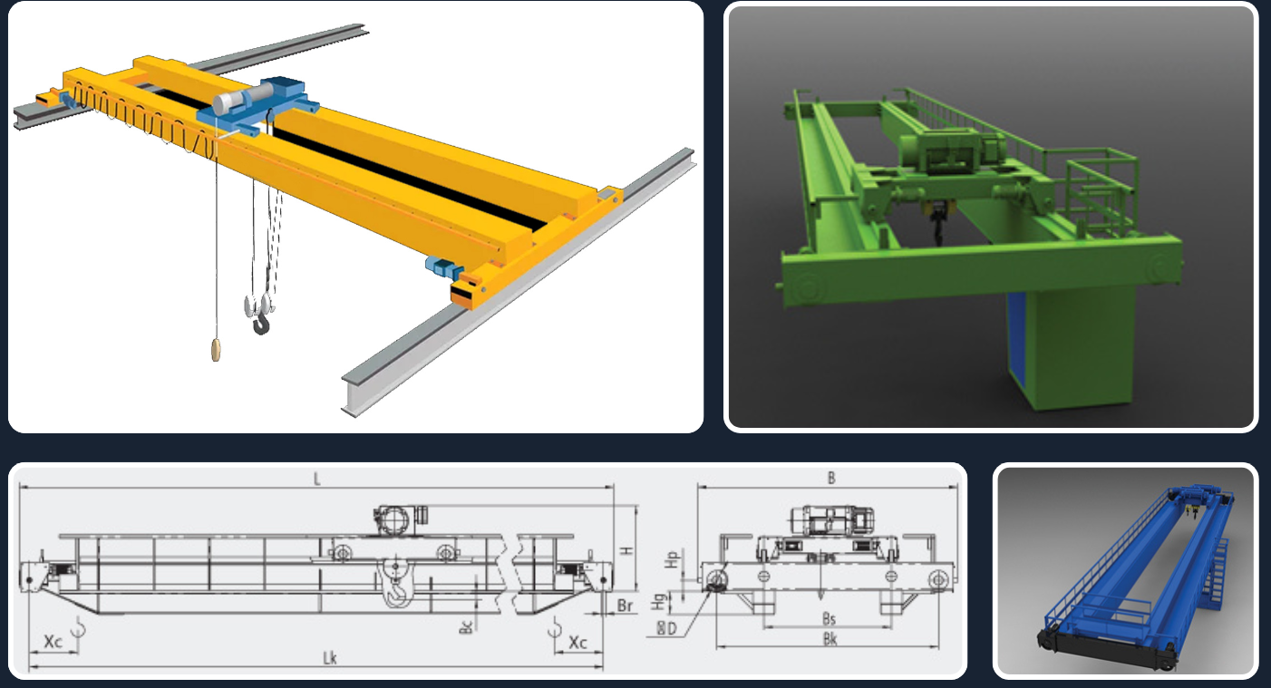 the module construction of a double-girder traveling crane with a lifting capacity of 3 to 100 tons, with a span of 10.5 to 50 m. Cranes are manufactured in a general-industry execution and also to operate in an explosive environment, for transportation of toxic, explosion and flammable substances as well as molten metal. They are used in indoor and outdoor storages, rail loading-unloading stations, on production sites.