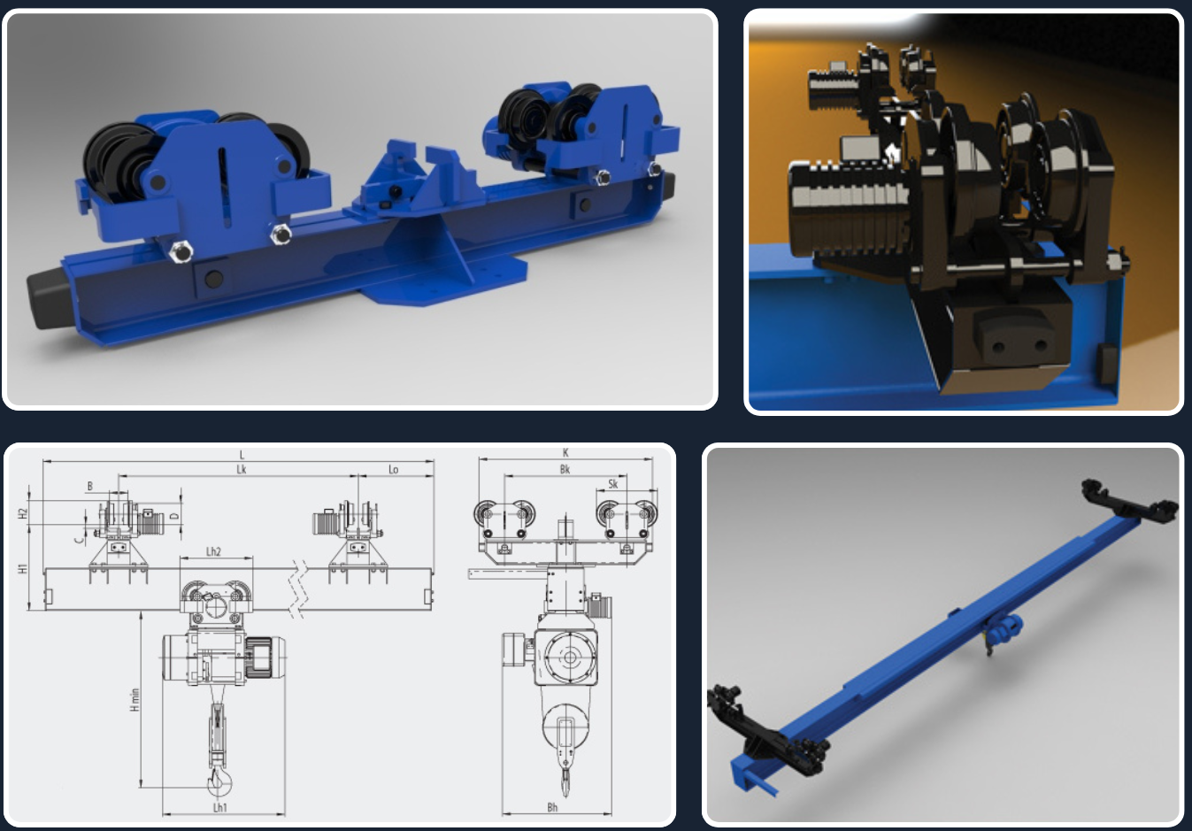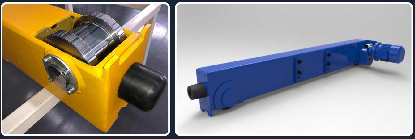 End Carriages , which are responsible for moving the crane along the longitudinal path using motors mounted on the wheels. They are also used in gantry cranes, suspended cranes, single and double cranes, according to the required condition and based on international specifications and calculations.