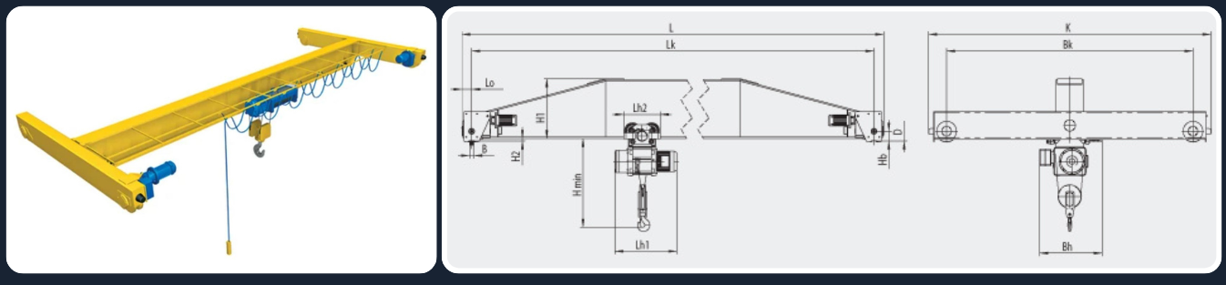 Single-girder underslung crane with an electric hoist is load lifting equipment for conveying loads in the space. The crane is controlled from the floor by a suspended control panel or wireless control Cranes are manufactured in a general-industry execution and also to operate in an explosive environment, for transportation of toxic, explosion and flammable substances as well as molten metal. By negotiation between the manufacturer and the customer, it is possible to manufacture cranes with a span of L k and lifting height of H, other than those specified.