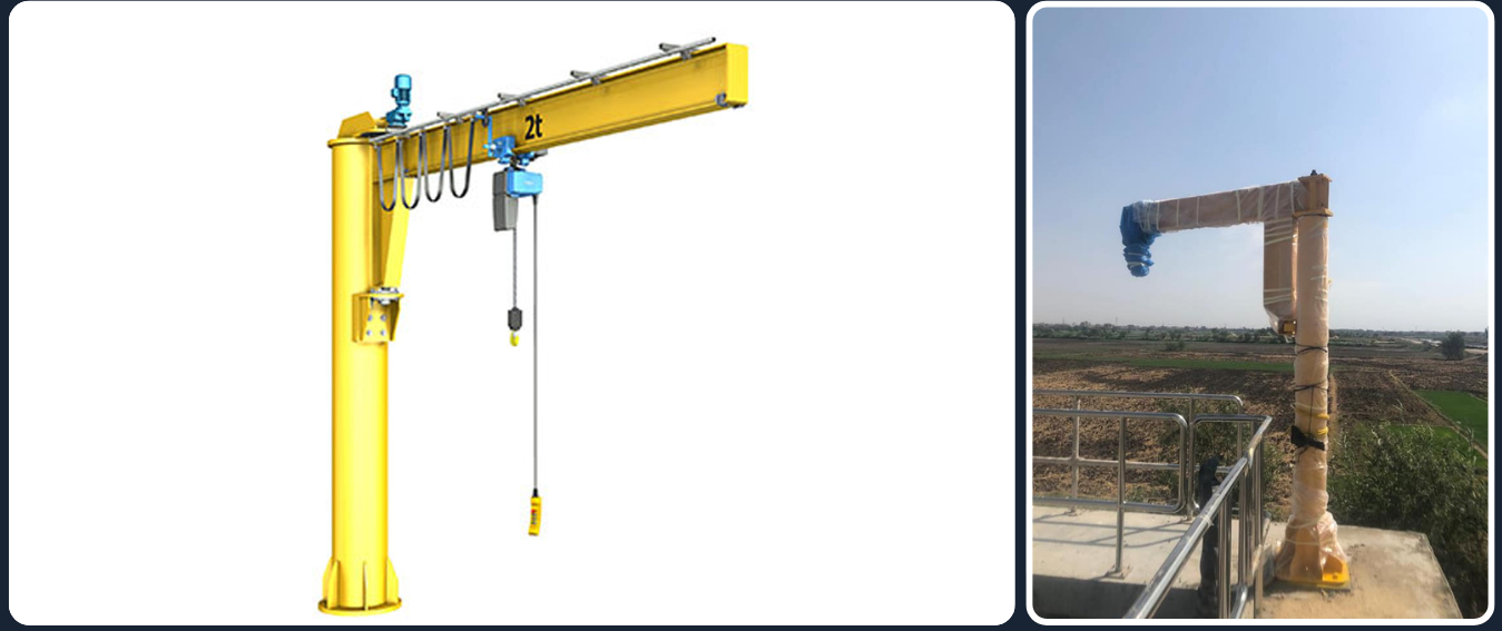 The jib crane or pivot winch is used in fixed locations and does not move because it is fixed to a concrete base according to the winch load, where the loads start from 250 kg up to 5 tons, provided that the rotation angle is manual or electric in different degrees from 180 degrees up to 360 degrees.